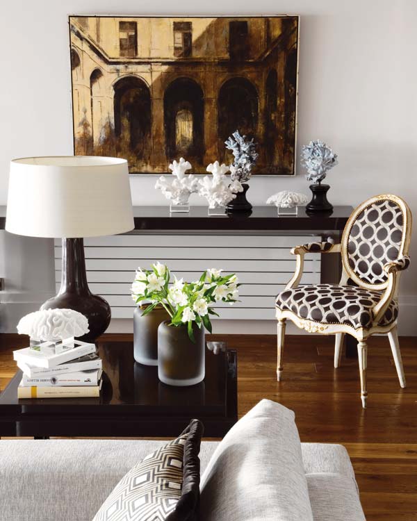 Here again, the zebra stool and the shape of the lamps brake the space from being too sober.